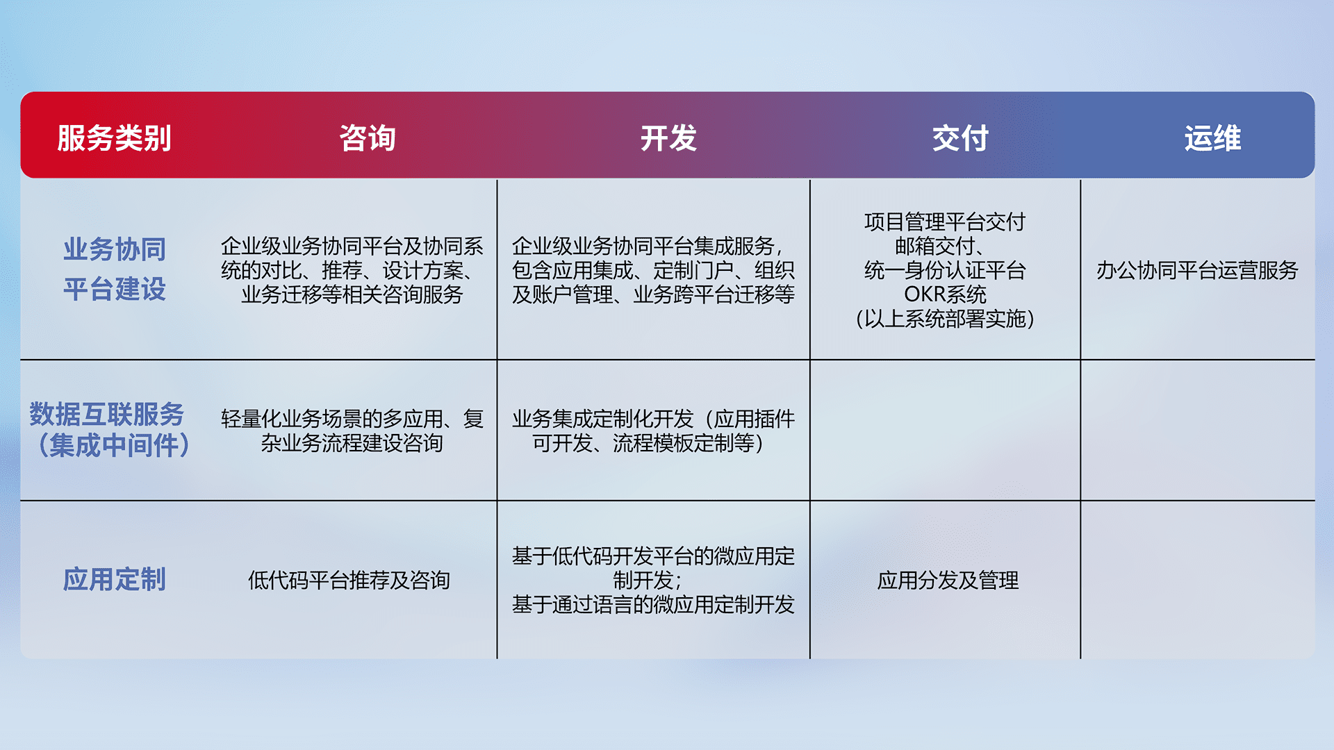 针对钉钉、、企微、、IDaas等平台级产品提供产品的规划、、、方案、、、、交付、、、、定制化开发等服务,,实现如统一协同办公、、、、智能客户服务、、、、混合会议管理、、智能数据查询、、等业务场景,,,,实现数字化转型。。